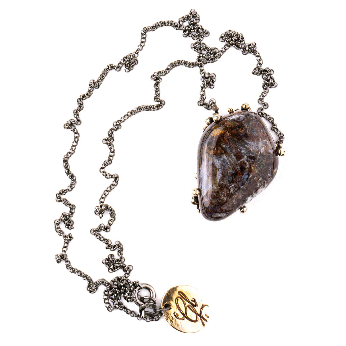MATERIALS AND FINISHING: Pietersite, oxidized sterling silver (chain), bronze.
