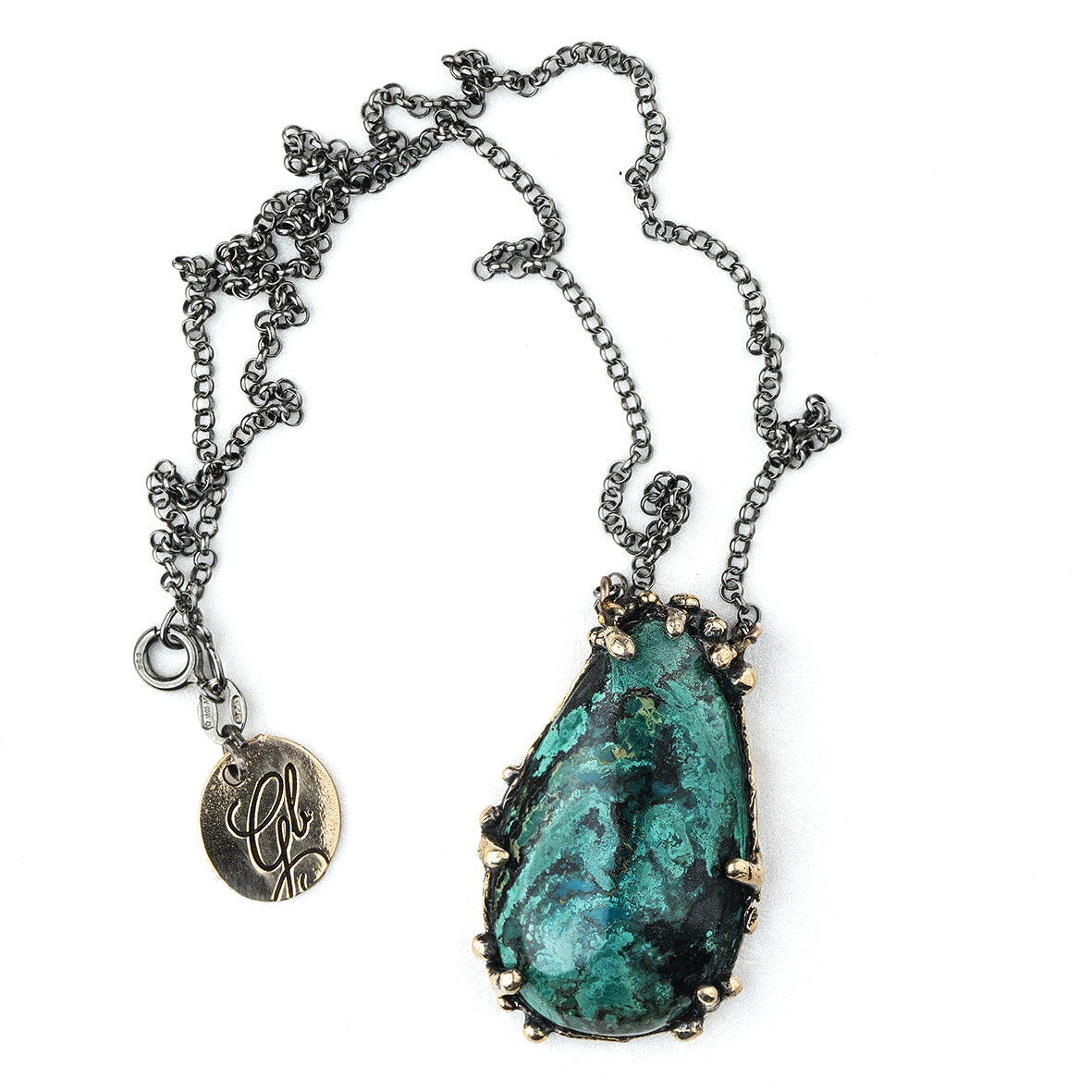 MATERIALS AND FINISHING: nickel-free burnished bronze (frame), oxidized sterling silver (chain), Eliat Stone from Israel.