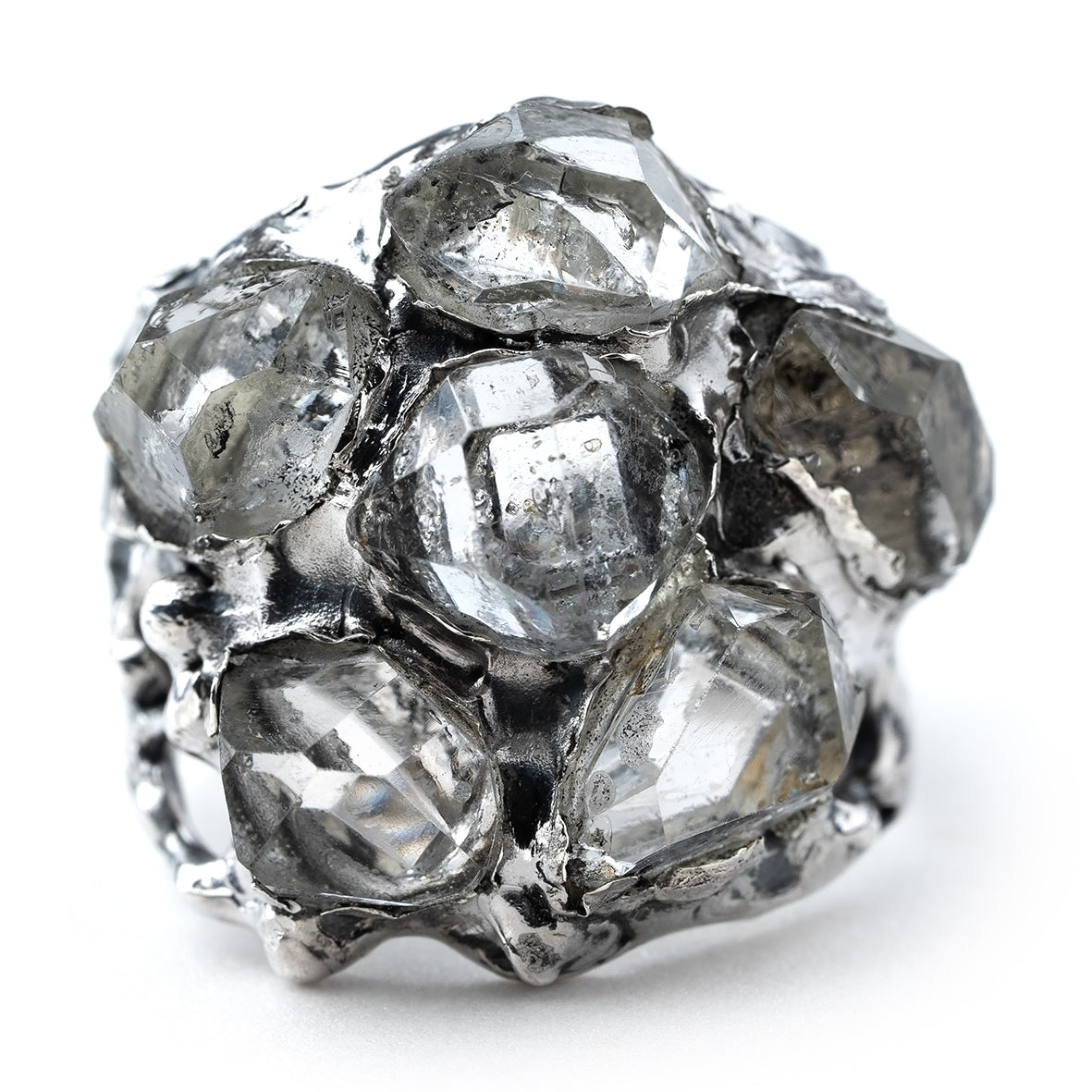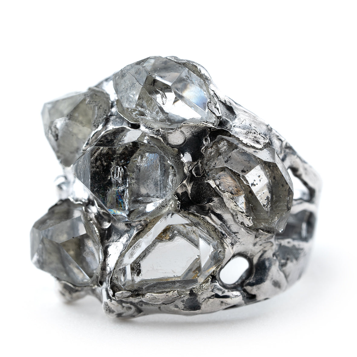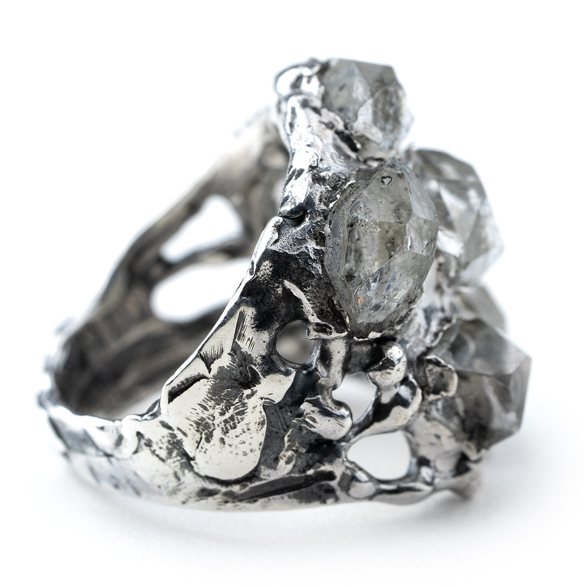 This ring is a rare creation, designed for those who embrace the extraordinary. Five luminous Herkimer diamonds are set organically, each finding its perfect place in a design that flows with nature’s raw beauty.