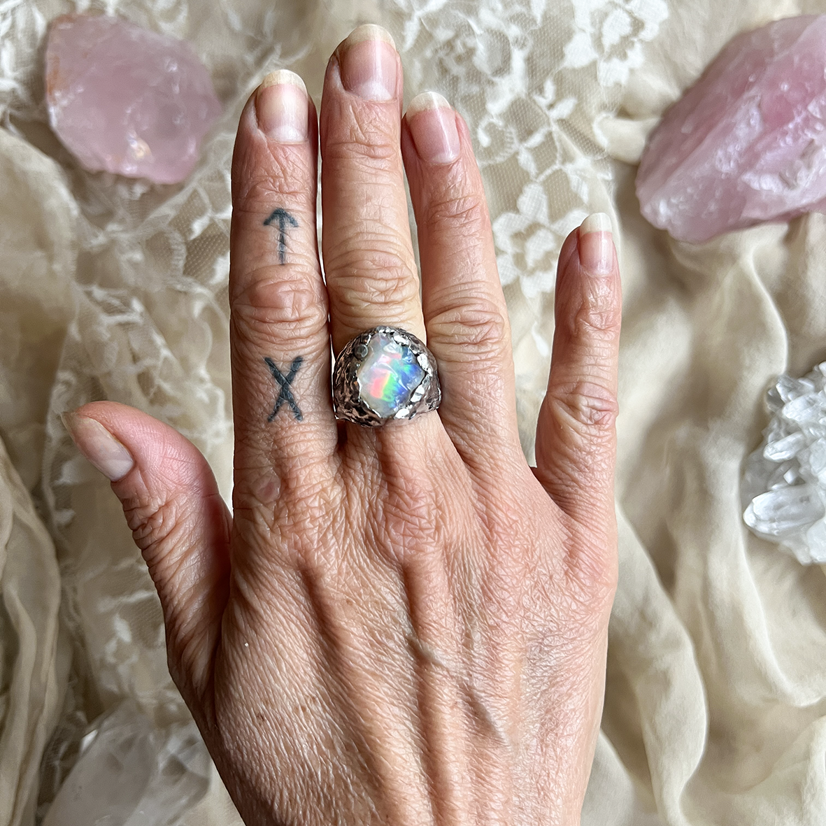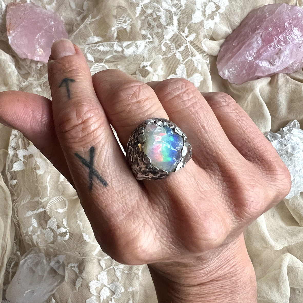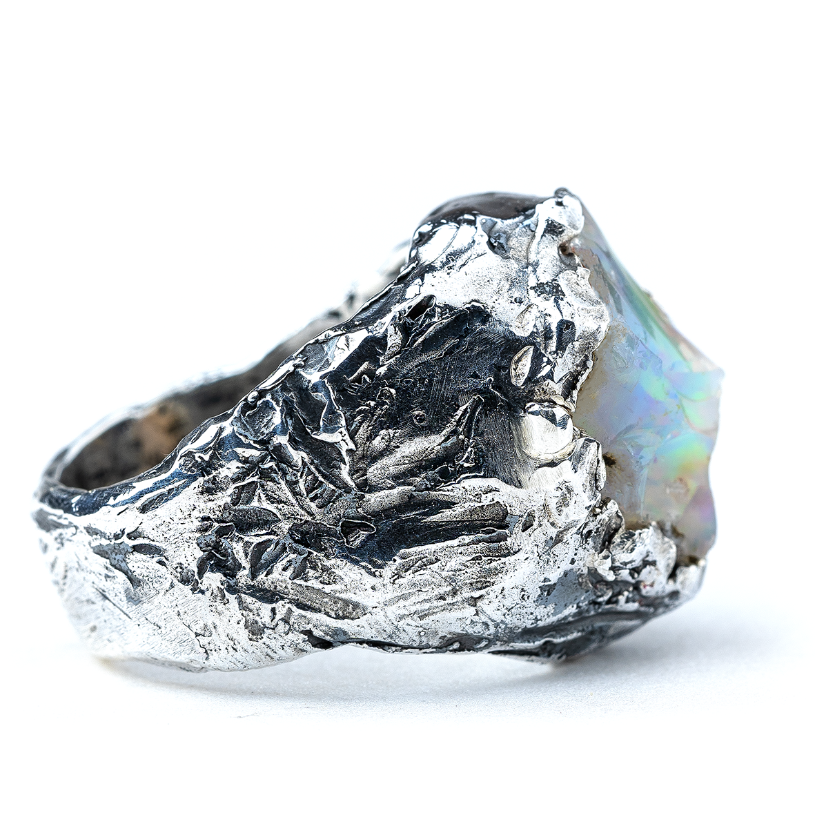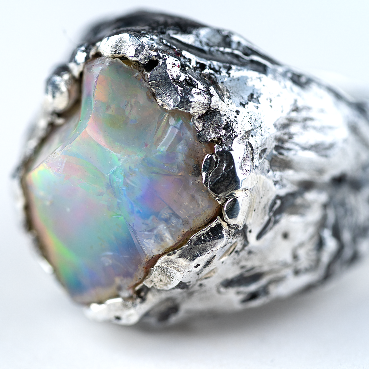 The centerpiece of this ring showcases a striking raw noble opal, renowned for its mesmerizing play of colors and its connection to creativity, intuition and transformation. As a true statement piece, this opal ring exudes individuality and elegance, making it a symbol of both personal expression and timeless beauty.
