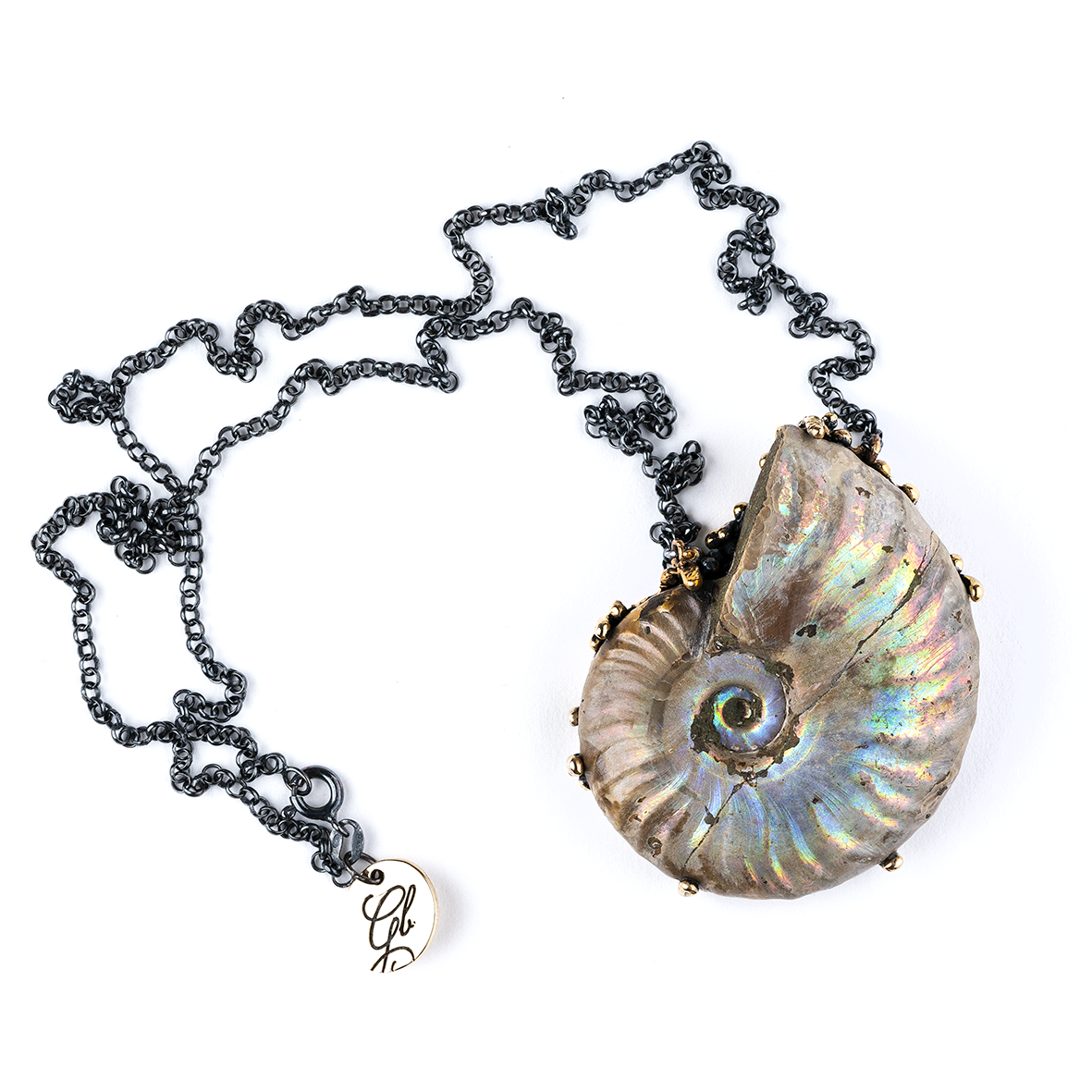 MATERIALS AND FINISHING: nickel-free bronze (frame and tag), oxidized sterling silver (chain), and Opalized Ammonite.