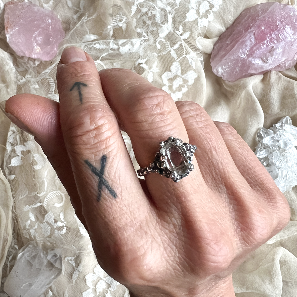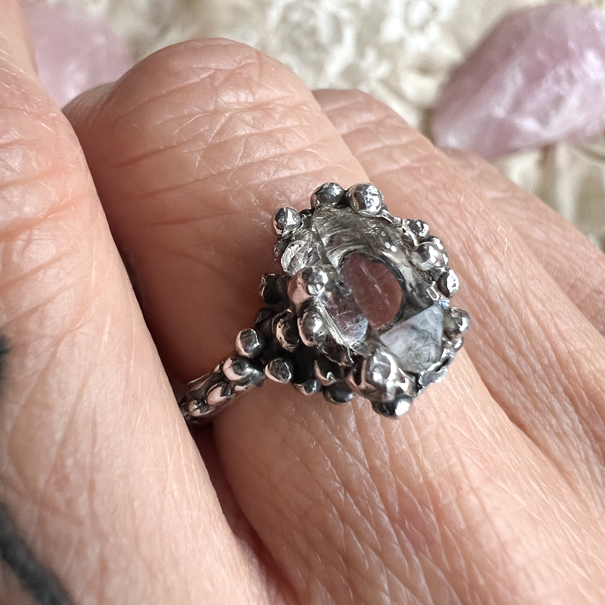 This raw elegance of the genuine Herkimer diamond is perfectly complemented by the ring’s organic design, creating a harmonious balance of rugged charm and refined artistry.