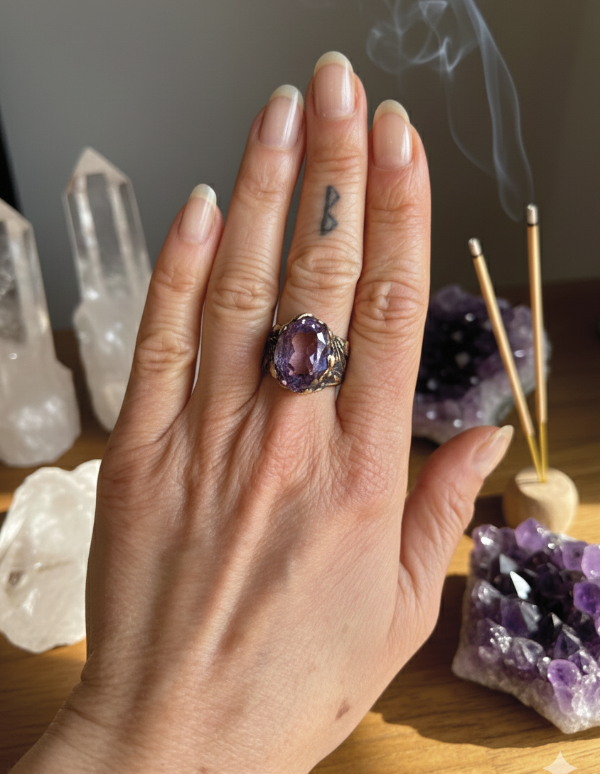 This ring holds a shiny amethyst, a stone that gently invites calm, clarity, and inner listening.