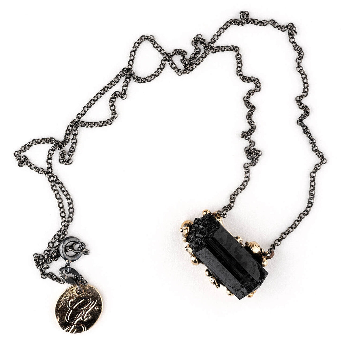 MATERIALS AND FINISHING: nickel-free burnished bronze (frame and tag), oxidized sterling silver (chain), Black Tourmaline.