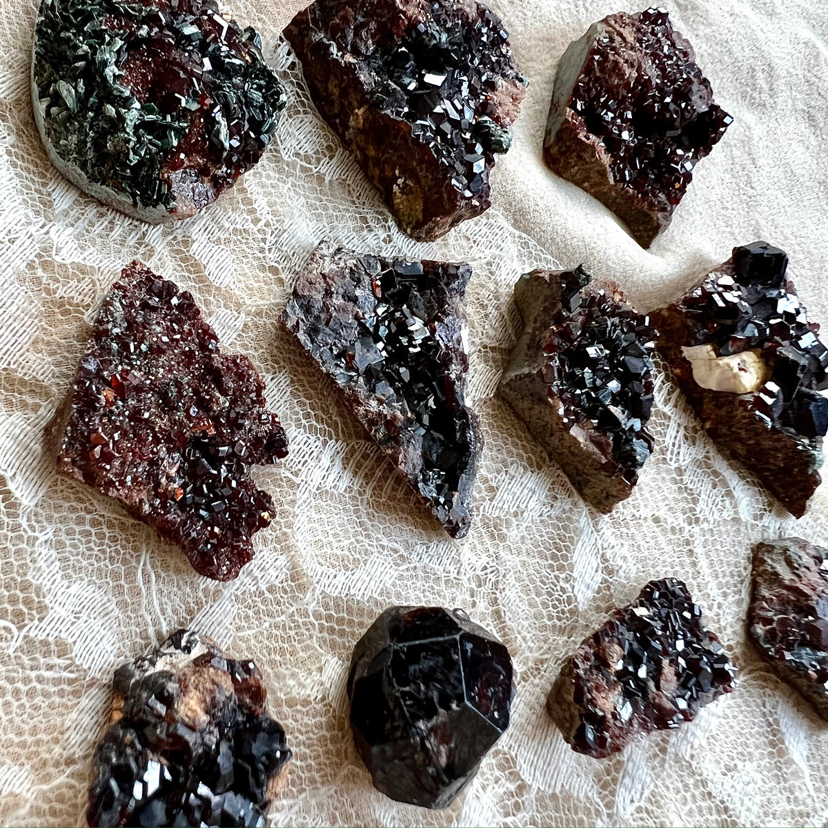 MATERIALS: Oxidized sterling silver chain, Garnet, and nickel-free bronze.