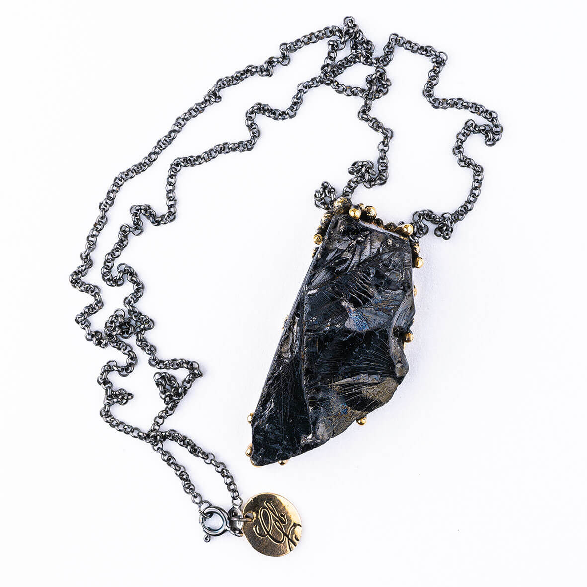 MATERIALS AND FINISHING: oxidized sterling silver (chain), nickel-free bronze (frame and tag), and genuine Silver Shungite from Carelia, Russia.