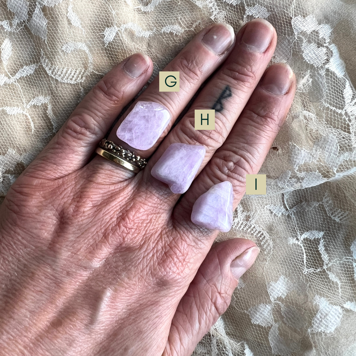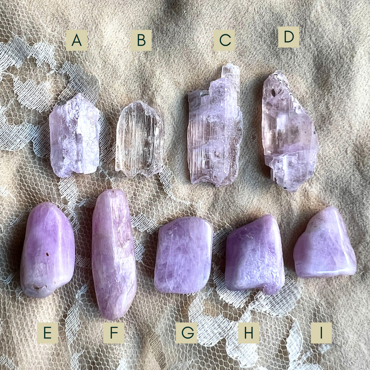 MATERIAL: nickel-free bronze and Pink Kunzite. The crystals from A to D are raw, and from E to I are tumbled.