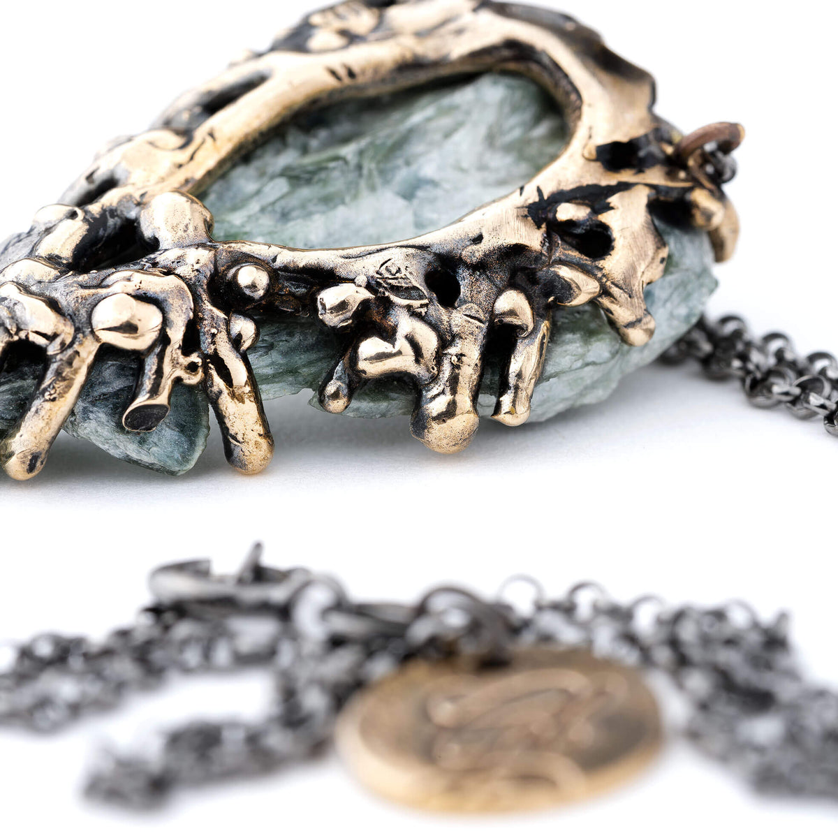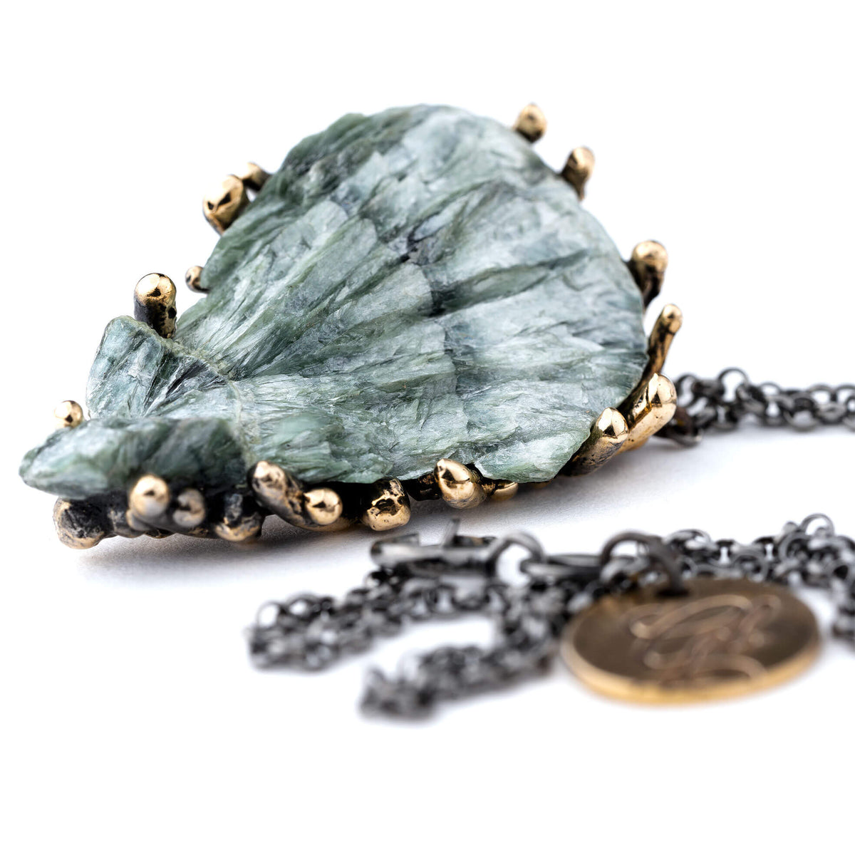 MATERIALS AND FINISHING: nickel-free bronze (frame and tag), sterling silver (chain) and raw Seraphinite.