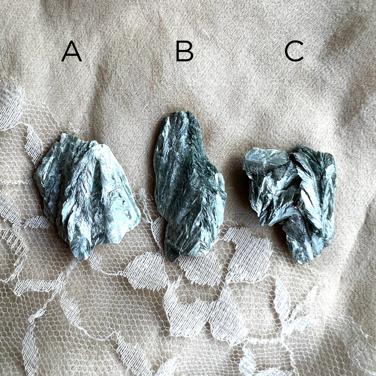 RELATED CHAKRA: Seraphinite raises the frequencies of all aura, especially on the Heart Chakra front and Third Eye Back.